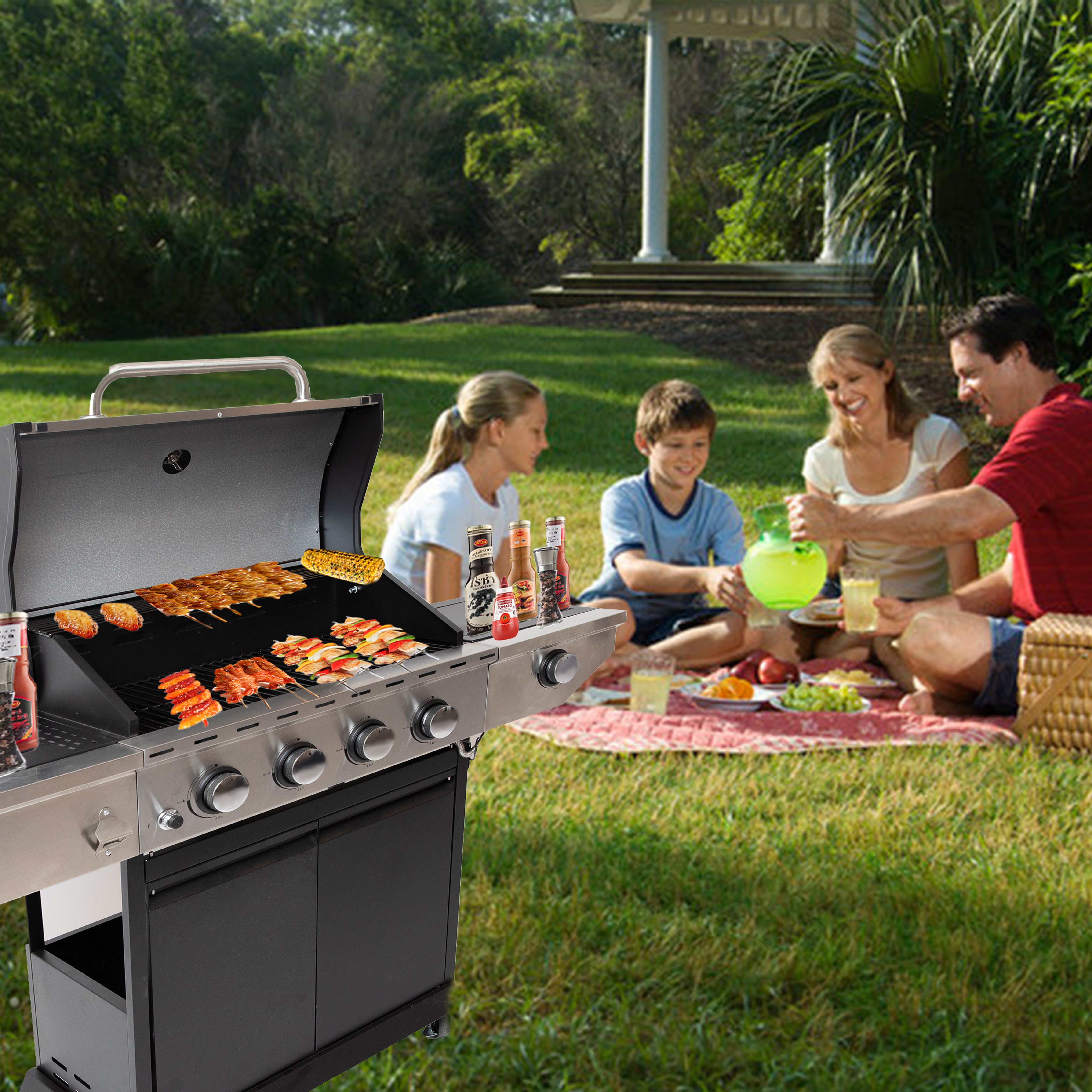 Propane Grill 4 Burner Barbecue Grill Stainless Steel Gas Grill with Side Burner and Thermometer for Outdoor BBQ;  Camping Propane Grill 4 Burner Barbecue Grill Stainless Steel Gas Grill with Side Burner and Thermometer for Outdoor BBQ;  Camping Propane Grill 4 Burner Barbecue Grill Stainless Steel Gas Grill with Side Burner and Thermometer for Outdoor BBQ;  Camping